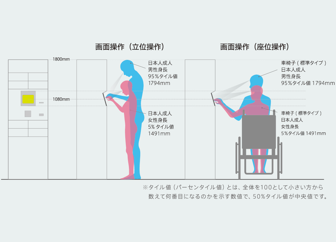 ポスタクは、ユーザーの操作性を最優先に考えて設計しています。人間工学に基づき、車椅子に座ったままでも、立位でも、視認性良くご利用いただけるユニバーサルデザインに仕上げました。
